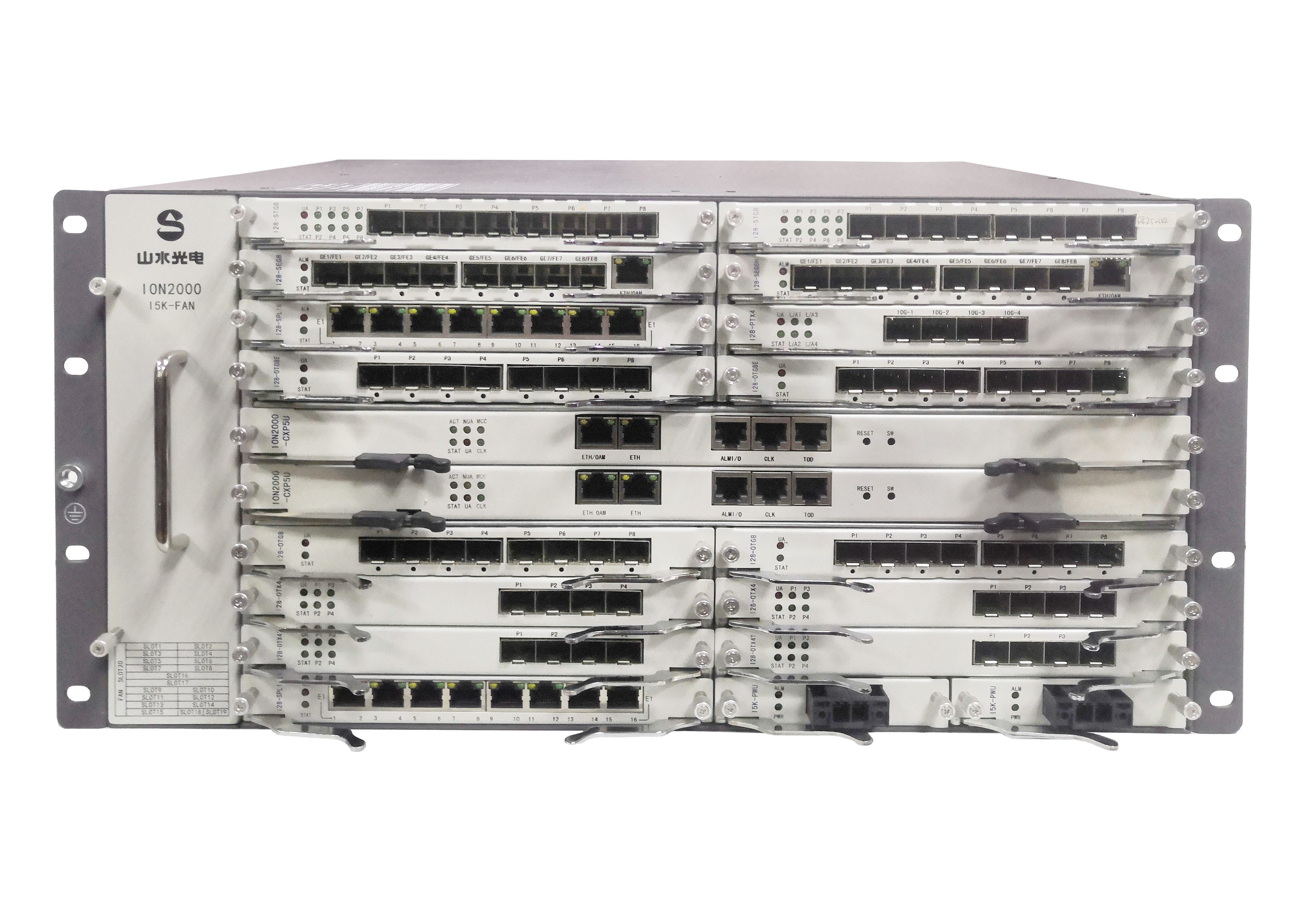 山水光电ION2000-5U是卡式分组型 OTN 接入设备,基于分组交换和 OTN 技术,产品定位于IPRAN/OTN网络的局端汇聚,支持 ODUk 交叉连接和 VC 交叉连接,具备 E1、FE、GE、10GE、STM-1、STM-4、STM-16、STM-64、ODU0、ODU1、ODU2 客户业务的接入,并传送到接入局所或综合业务接入节点的 OTN 网络中,采用 OTUk 接口的 IrDI 用于不同厂商传送设备对接,能够实现对接入业务的汇聚、整合和疏导;设备具有配置简单、适合各种大小带宽业务、端到端的组网、及电信级保护的能力,支持被第三方网管平台配置/管理。